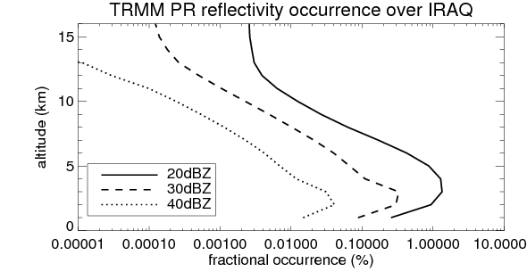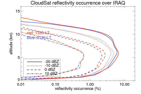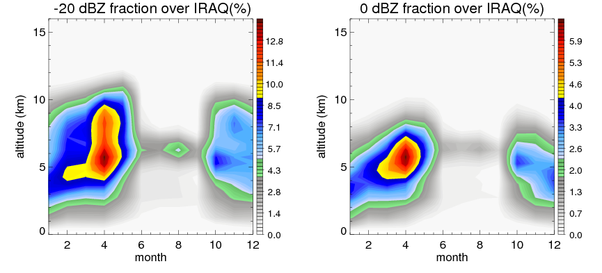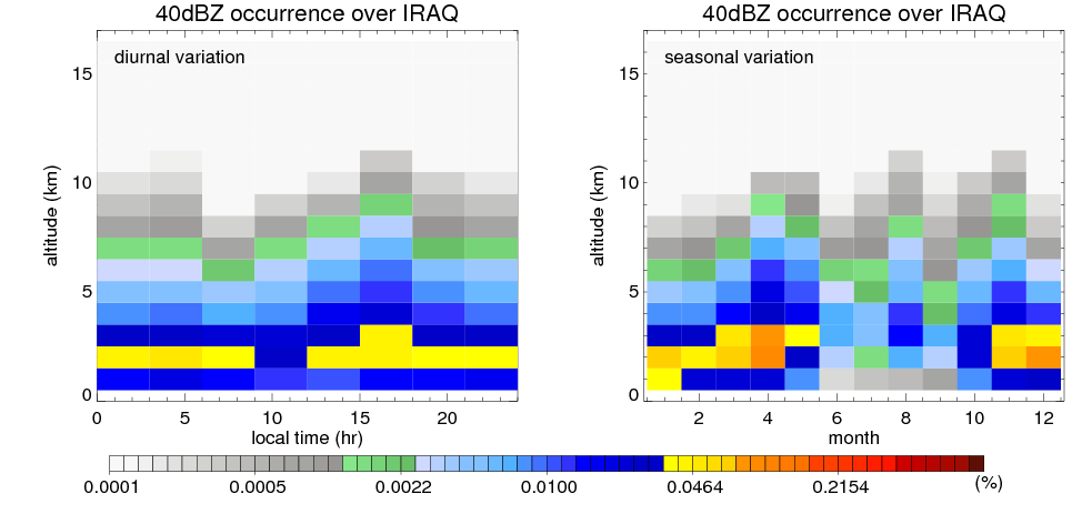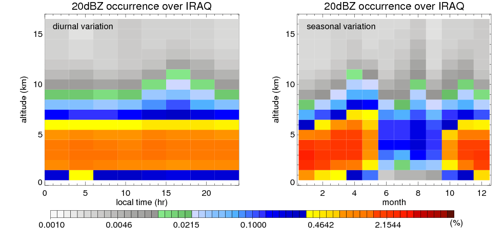 Here the precipitation means the precipitable hydrometeors (raindrops, snow flakes, graupel and hails) that detected by TRMM precipitation radar. Following figure shows the vertical profiles of 20, 30 and 40 dBZ fractional occurrence over IRAQ in different seasons. The seasonal and diurnal variations of precipitation (20 dBZ) fractional occurrence at different altitudes are shown below: The seasonal and diurnal variations of INTENSIVE precipitation (40 dBZ) fractional occurrence at different altitudes are shown below: Clouds are consisted of small hydrometeors that undetectable by TRMM precipitation radar (Ku band). CloudSat (W band radar) provides the much great details of clouds. Following figure shows the vertical structure of the thin and thick clouds over IRAQ. Note that high reflectivity at low levels are less frequent due to the attenuation. The seasonal variation of thin (-20 dBZ) and thick (0 dBZ) cloud over IRAQ are shown below: |