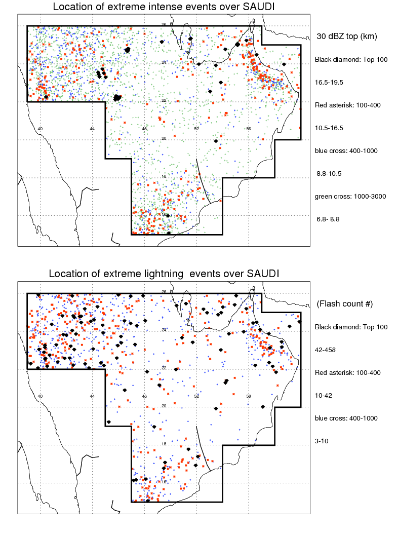 Following figure shows the location of the precipitation feautres categorized by the lightning rate and 30 dBZ echo top.