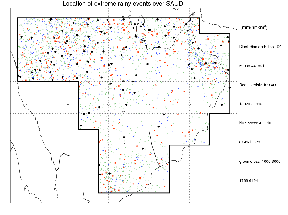 Following figure shows the location of the precipitation feautres categorized by the volumetric rainfall.