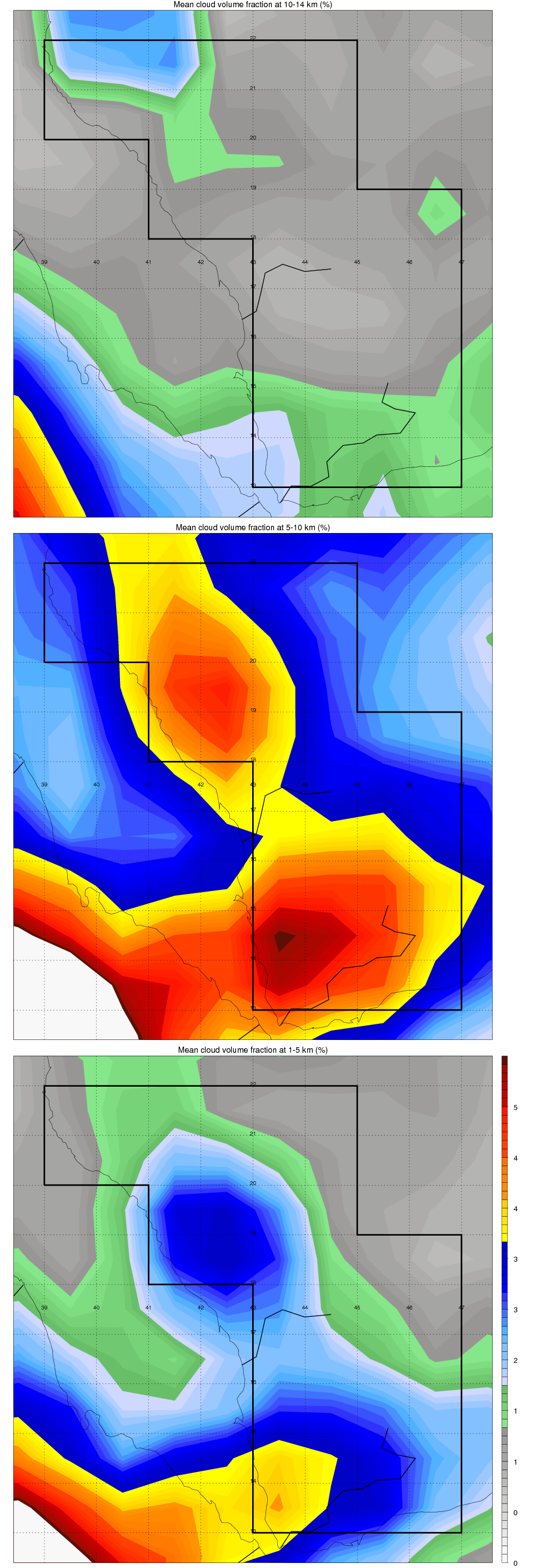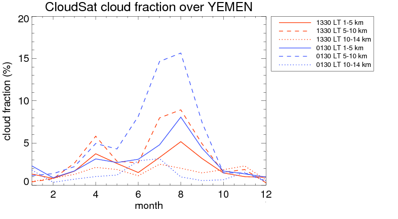 Over YEMEN , mean high level (10-14 km) cloud volume fraction is about 1.4%. Mean mid level (5-10 km) cloud volume fraction is about 4.3%. Mean low level (1-5 km) cloud volume fraction is about 2.6%. Seasonal and day vs. night variations of high, mid and low level cloud fraction over YEMEN are shown in following figure. You may check the details of cloud fraction in various seasons and at different local times. |