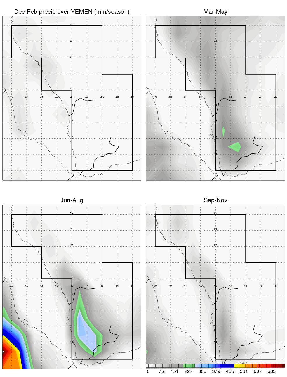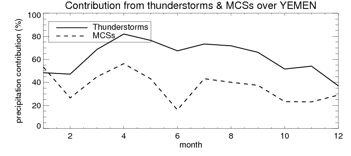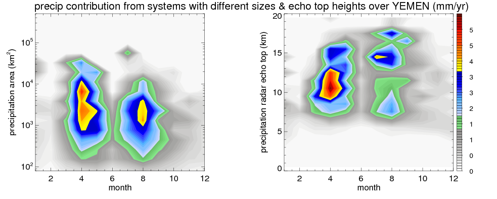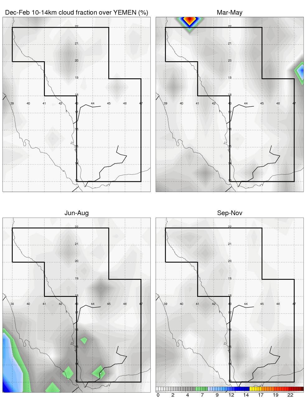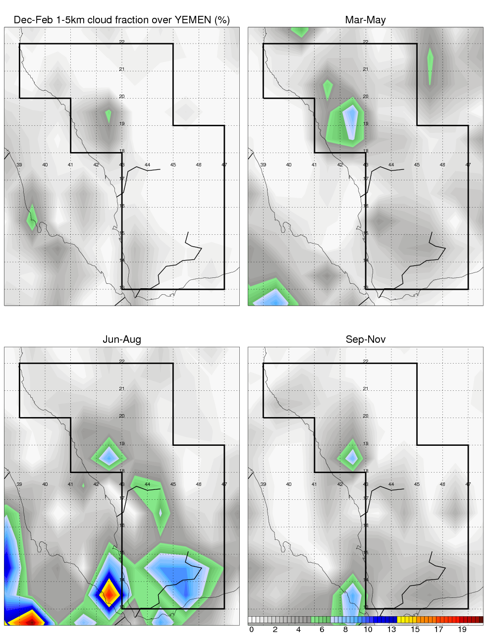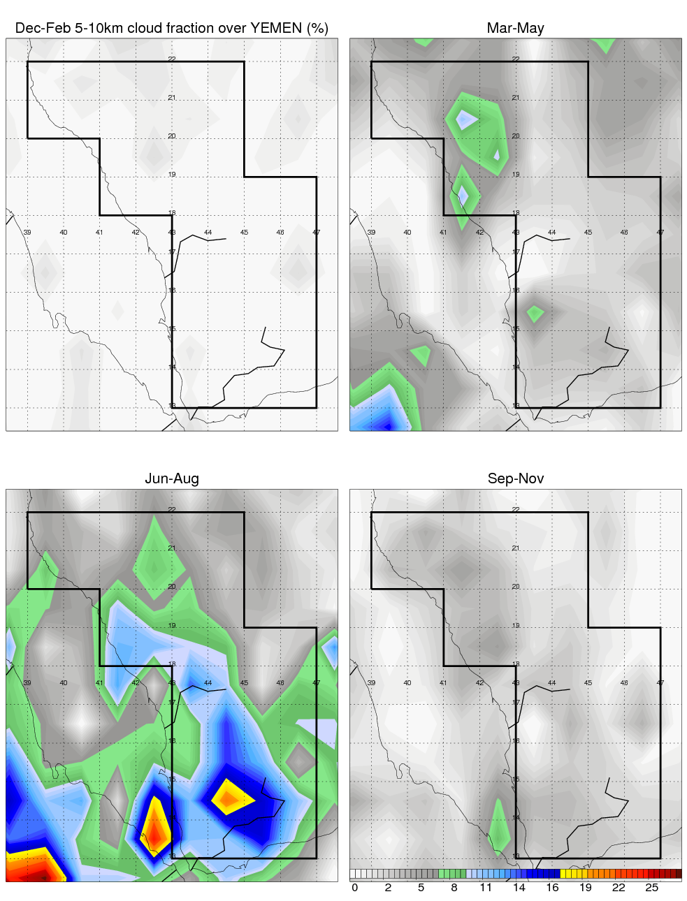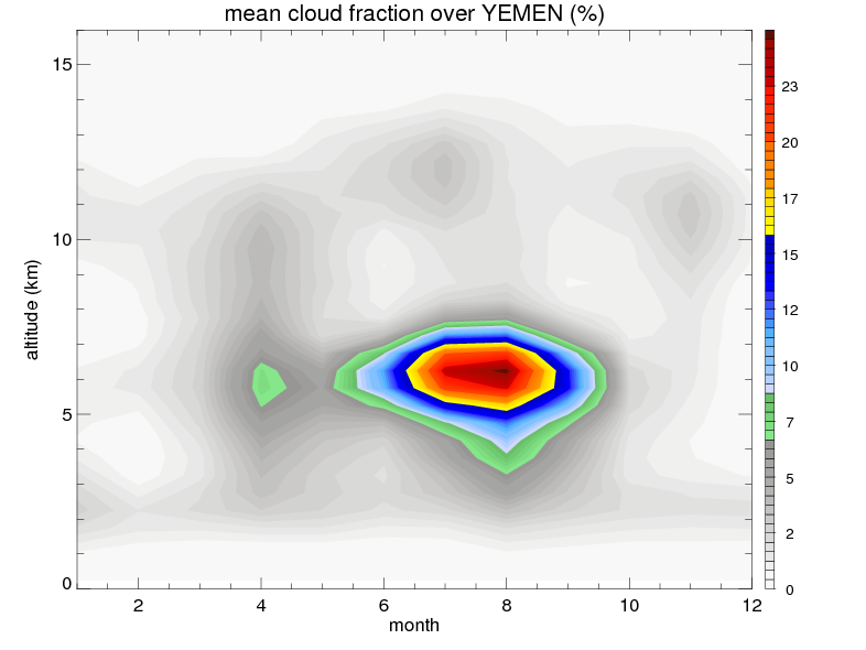 Over YEMEN , mean annual precipitation are estimated with 210.8 (mm/year) from TRMM precipitation radar. (distribution of precipitation see here ) Total surface rainfall is brought by various precipitation systems. The seasonal variation of precipitation from systems with different sizes and heights are shown below: In total, thunderstorms (systems with detected lightning flashes) contribute 70 %, MCSs (Mesoscale convective systems with raining area > 2000 km^2) contribute 42 % of all precipitation. Seasonal variations of fraction of precipitation from thunderstorms and MCSs are shown below: The seasonal variation of geographical distribution of CloudSat cloud fraction over YEMEN is shown below: The seasonal variation of mean CloudSat level cloud fraction at different altitudes over YEMEN is shown below: |