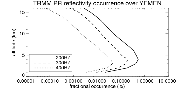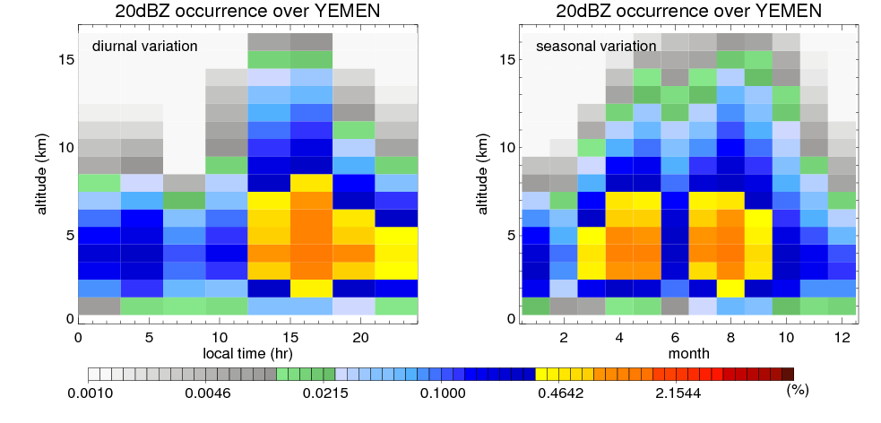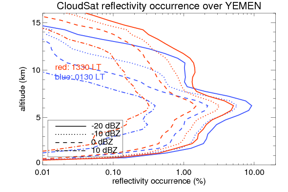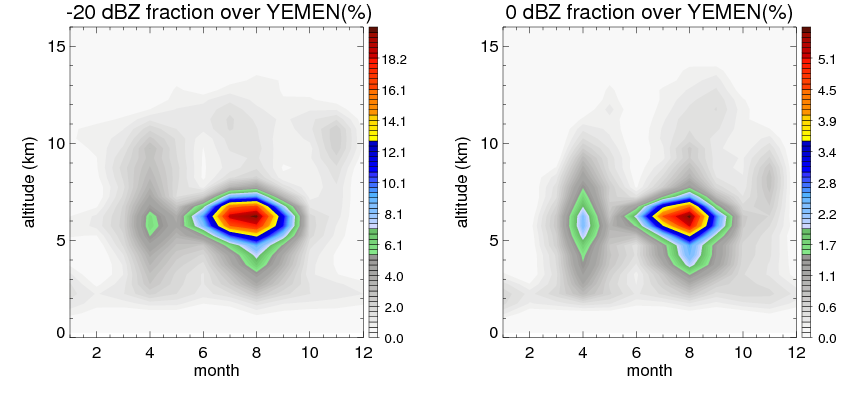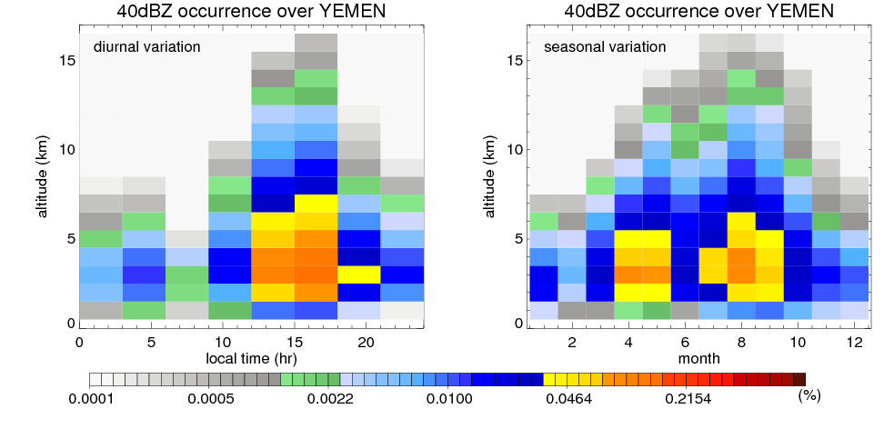 Here the precipitation means the precipitable hydrometeors (raindrops, snow flakes, graupel and hails) that detected by TRMM precipitation radar. Following figure shows the vertical profiles of 20, 30 and 40 dBZ fractional occurrence over YEMEN in different seasons. The seasonal and diurnal variations of precipitation (20 dBZ) fractional occurrence at different altitudes are shown below: The seasonal and diurnal variations of INTENSIVE precipitation (40 dBZ) fractional occurrence at different altitudes are shown below: Clouds are consisted of small hydrometeors that undetectable by TRMM precipitation radar (Ku band). CloudSat (W band radar) provides the much great details of clouds. Following figure shows the vertical structure of the thin and thick clouds over YEMEN. Note that high reflectivity at low levels are less frequent due to the attenuation. The seasonal variation of thin (-20 dBZ) and thick (0 dBZ) cloud over YEMEN are shown below: |