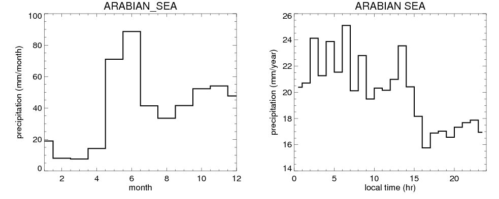 Over ARABIAN_SEA , mean annual precipitation are estimated with 479.1 (mm/year) from precipitation radar, and 450.1 (mm/year) from microwave radiometer observations. (see high resolution precipitation product , NOTE: it may take long time to generate for large area) In total, thunderstorms (systems with detected lightning flashes) contribute 22 %, MCSs (Mesoscale convective systems with raining area > 2000 km^2) contribute 60 % of all precipitation. Seasonal and diurnal variations of rainfall over ARABIAN_SEA are shown in following figure. You may check the details of rainfall contributions from precipitation systems with different sizes and intensities in various seasons and at different local times. |