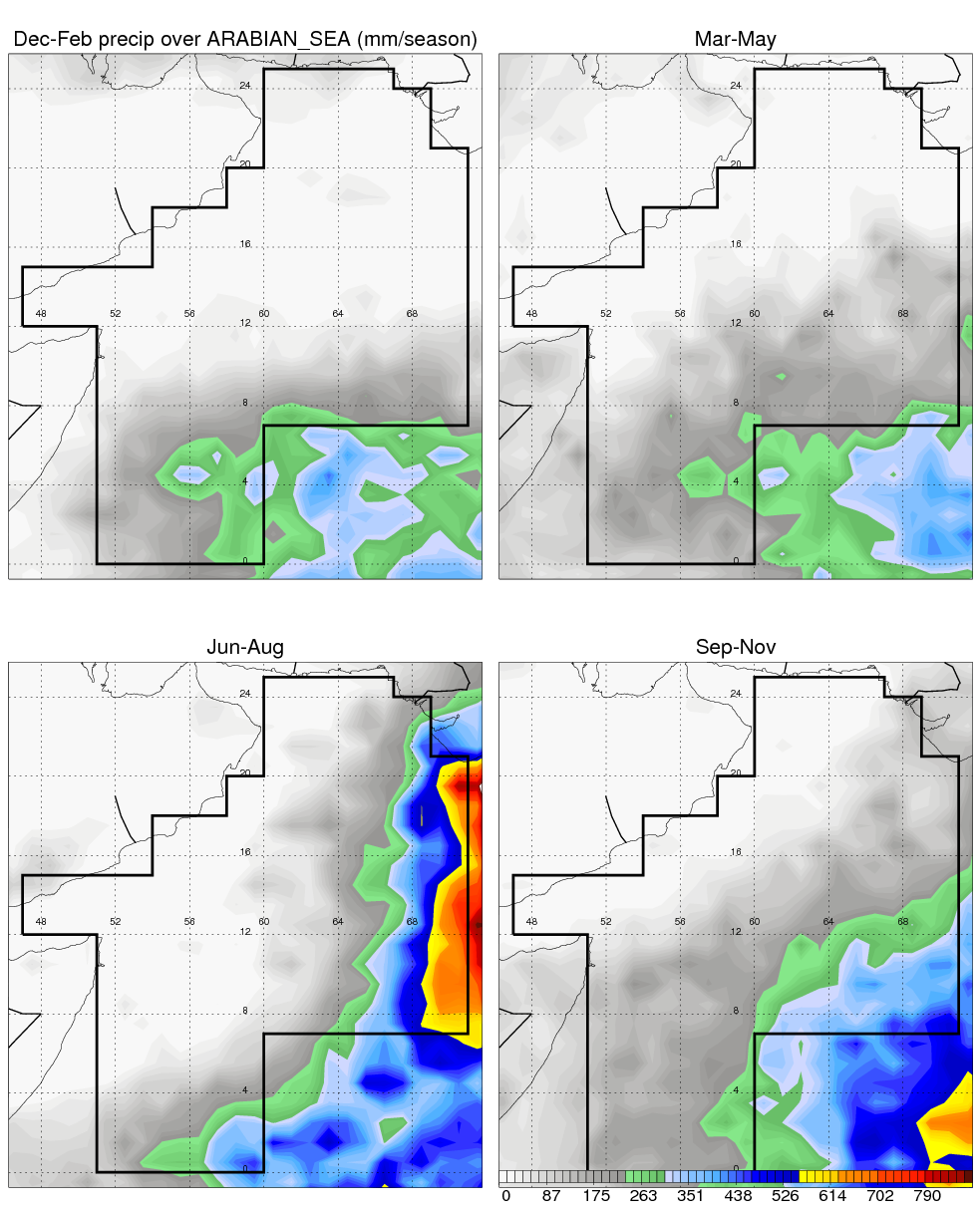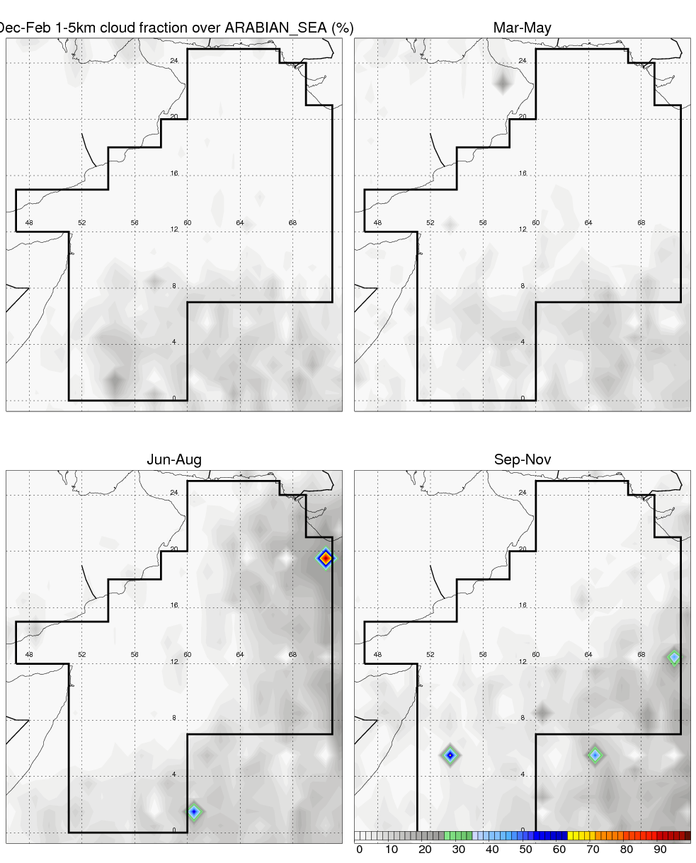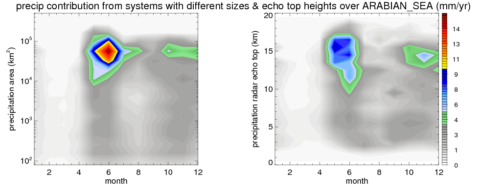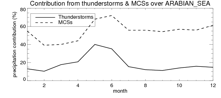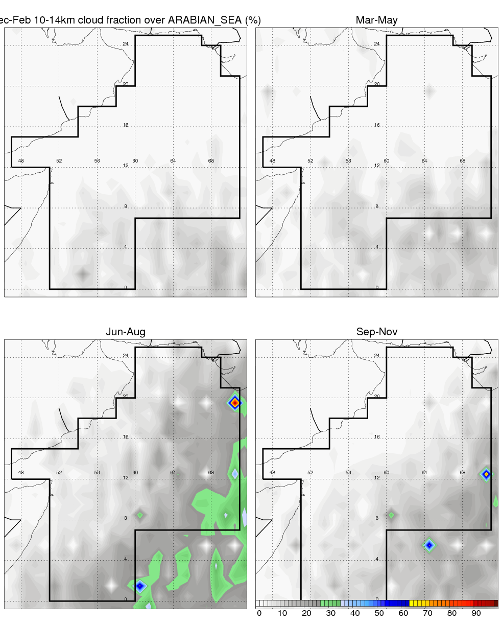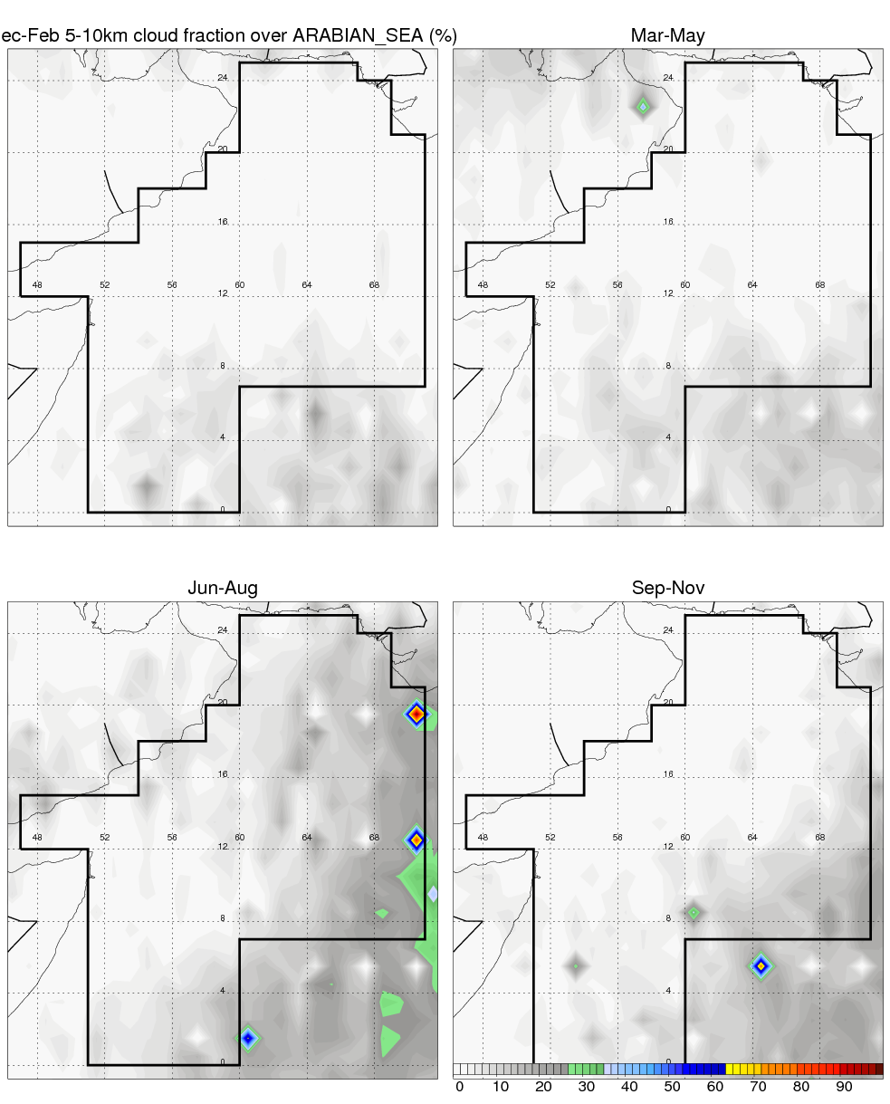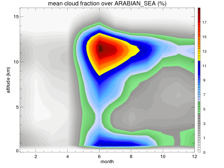 Over ARABIAN_SEA , mean annual precipitation are estimated with 479.1 (mm/year) from TRMM precipitation radar. (distribution of precipitation see here ) Total surface rainfall is brought by various precipitation systems. The seasonal variation of precipitation from systems with different sizes and heights are shown below: In total, thunderstorms (systems with detected lightning flashes) contribute 22 %, MCSs (Mesoscale convective systems with raining area > 2000 km^2) contribute 60 % of all precipitation. Seasonal variations of fraction of precipitation from thunderstorms and MCSs are shown below: The seasonal variation of geographical distribution of CloudSat cloud fraction over ARABIAN_SEA is shown below: The seasonal variation of mean CloudSat level cloud fraction at different altitudes over ARABIAN_SEA is shown below: |