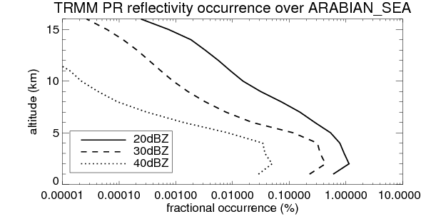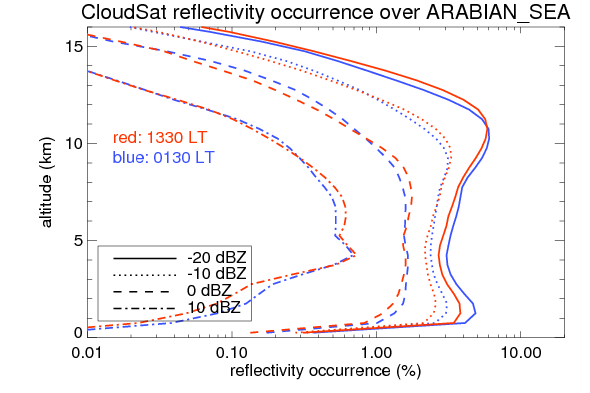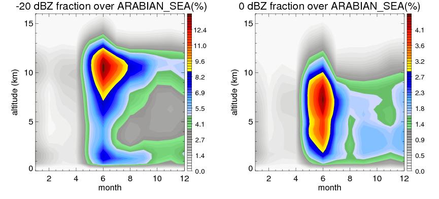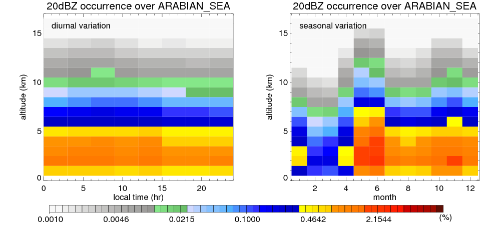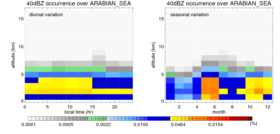 Here the precipitation means the precipitable hydrometeors (raindrops, snow flakes, graupel and hails) that detected by TRMM precipitation radar. Following figure shows the vertical profiles of 20, 30 and 40 dBZ fractional occurrence over ARABIAN_SEA in different seasons. The seasonal and diurnal variations of precipitation (20 dBZ) fractional occurrence at different altitudes are shown below: The seasonal and diurnal variations of INTENSIVE precipitation (40 dBZ) fractional occurrence at different altitudes are shown below: Clouds are consisted of small hydrometeors that undetectable by TRMM precipitation radar (Ku band). CloudSat (W band radar) provides the much great details of clouds. Following figure shows the vertical structure of the thin and thick clouds over ARABIAN_SEA. Note that high reflectivity at low levels are less frequent due to the attenuation. The seasonal variation of thin (-20 dBZ) and thick (0 dBZ) cloud over ARABIAN_SEA are shown below: |