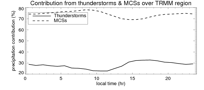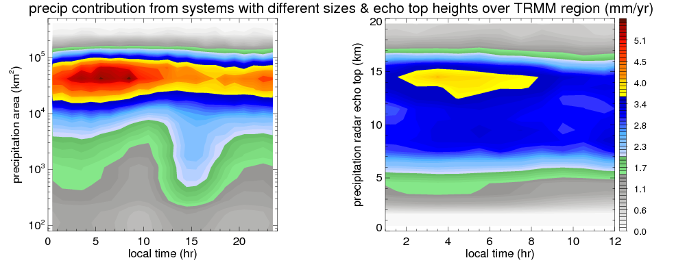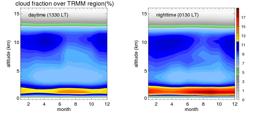 Many studies suggested that the diurnal variation of the precipitation is related to the life cycles of the precipitation systems, which is frequently driven by the surface sensible heating. Over TRMM region, mean annual precipitation are estimated with 975.7 (mm/year) from precipitation radar. Detailed diurnal variation of the precipitation at high resolution can be accessed here (NOTE: it may take long time to generate for a large area). The diurnal variation of precipitation from systems with different sizes and heights are shown below: In total, thunderstorms (systems with detected lightning flashes) contribute 28 %, MCSs (Mesoscale convective systems with raining area > 2000 km^2) contribute 74 % of all precipitation over TRMM region. Diurnal variations of fraction of precipitation from thunderstorms and MCSs over TRMM region are shown below: Certainly there is a strong diurnal variation of different types of clouds. Because CloudSat observes at 0130 and 1330 local time, here the daytime and night cloud fraction in different seasons are presented: |