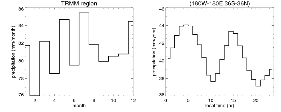 Over TRMM region , mean annual precipitation are estimated with 975.7 (mm/year) from precipitation radar, and 982.7 (mm/year) from microwave radiometer observations. (see high resolution precipitation product , NOTE: it may take long time to generate for large area) In total, thunderstorms (systems with detected lightning flashes) contribute 28 %, MCSs (Mesoscale convective systems with raining area > 2000 km^2) contribute 74 % of all precipitation. Seasonal and diurnal variations of rainfall over TRMM region are shown in following figure. You may check the details of rainfall contributions from precipitation systems with different sizes and intensities in various seasons and at different local times. |
