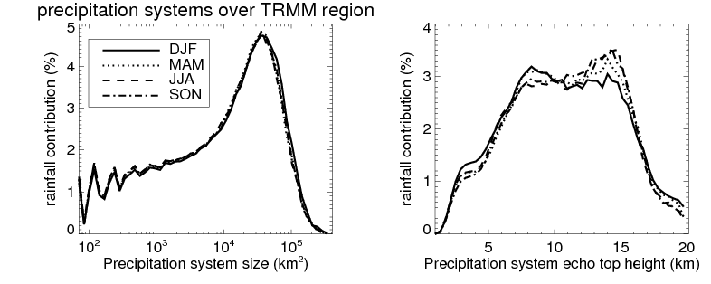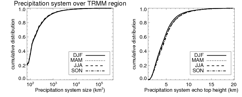 Over TRMM region , mean size of precipitation system about 731.8 (km^2) and mean maximum radar echo top height of these precipitation systems is about 5.1 km. Following figure shows the cumulative distribution of the sizes and depths of the precipitation systems in different seasons: Though usually there are more small systems, the larger systems would bring more total precipitation. |
