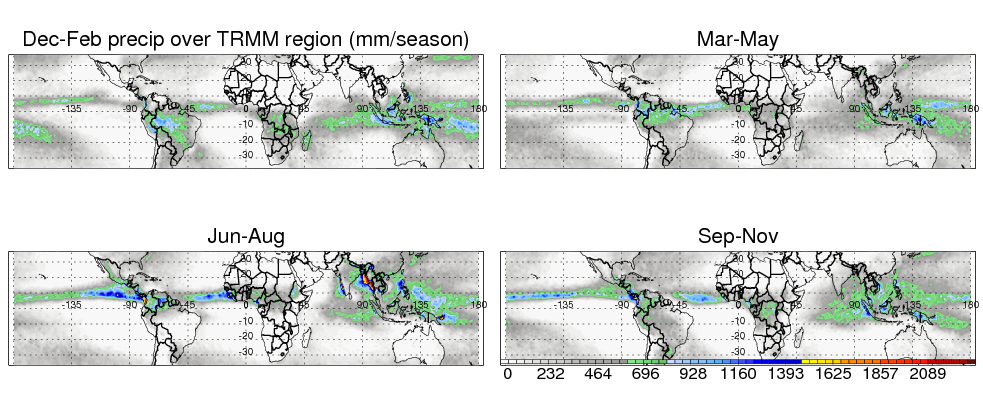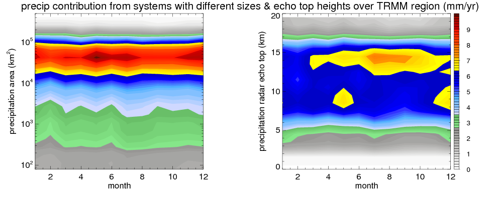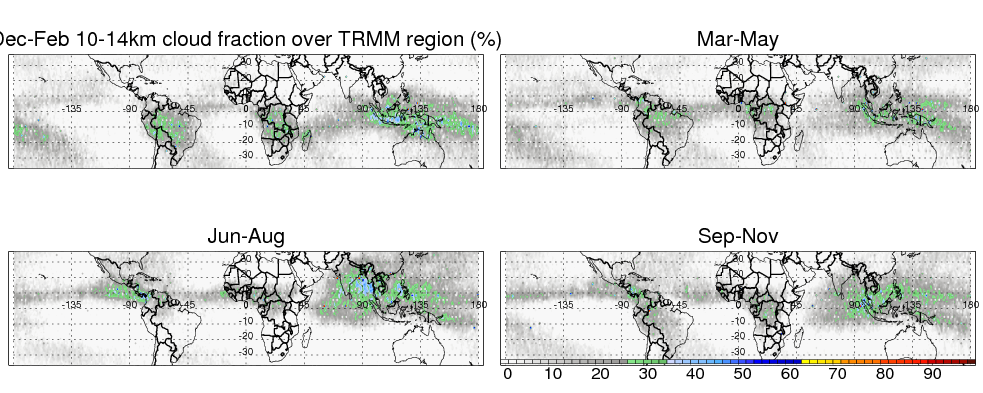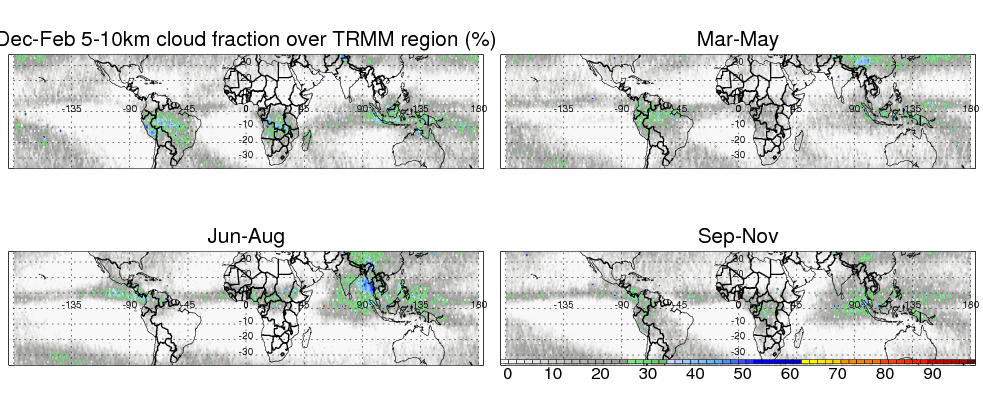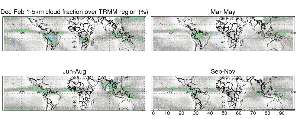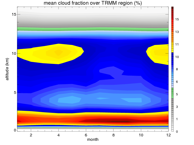 Over TRMM region , mean annual precipitation are estimated with 975.7 (mm/year) from TRMM precipitation radar. (distribution of precipitation see here ) Total surface rainfall is brought by various precipitation systems. The seasonal variation of precipitation from systems with different sizes and heights are shown below: In total, thunderstorms (systems with detected lightning flashes) contribute 28 %, MCSs (Mesoscale convective systems with raining area > 2000 km^2) contribute 74 % of all precipitation. Seasonal variations of fraction of precipitation from thunderstorms and MCSs are shown below: The seasonal variation of geographical distribution of CloudSat cloud fraction over TRMM region is shown below: The seasonal variation of mean CloudSat level cloud fraction at different altitudes over TRMM region is shown below: |