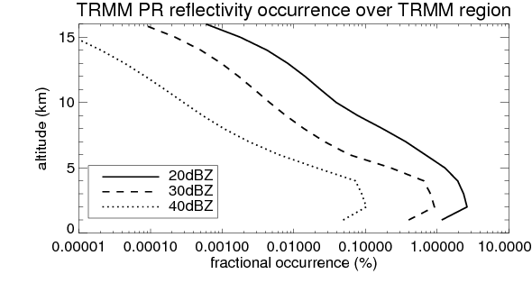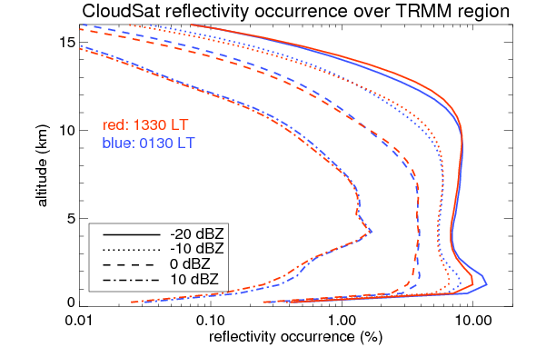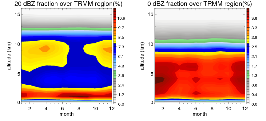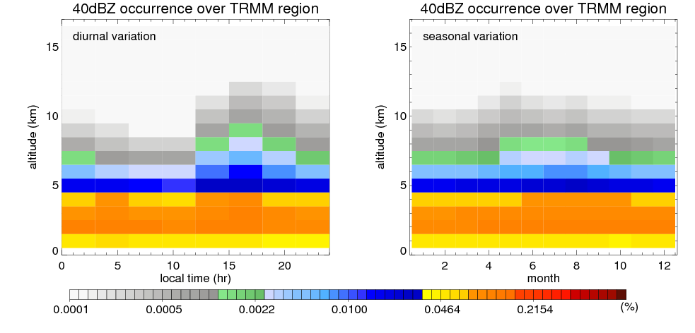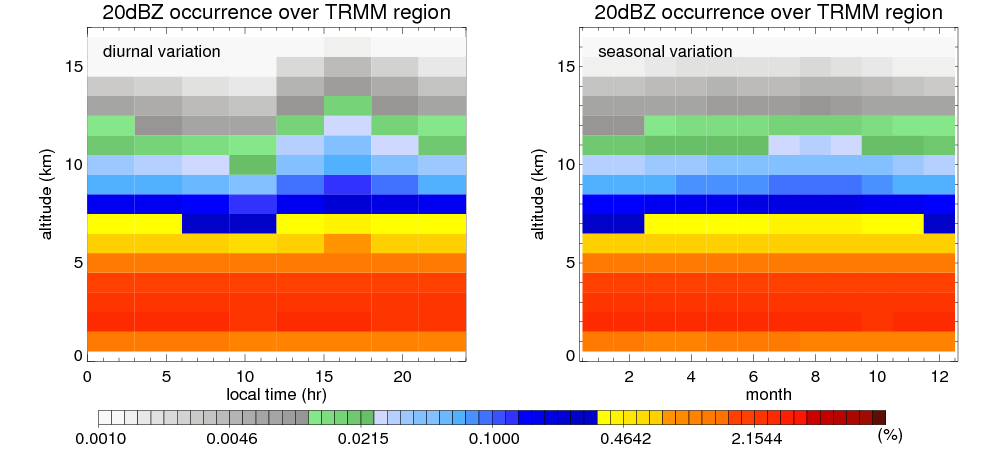 Here the precipitation means the precipitable hydrometeors (raindrops, snow flakes, graupel and hails) that detected by TRMM precipitation radar. Following figure shows the vertical profiles of 20, 30 and 40 dBZ fractional occurrence over TRMM region in different seasons. The seasonal and diurnal variations of precipitation (20 dBZ) fractional occurrence at different altitudes are shown below: The seasonal and diurnal variations of INTENSIVE precipitation (40 dBZ) fractional occurrence at different altitudes are shown below: Clouds are consisted of small hydrometeors that undetectable by TRMM precipitation radar (Ku band). CloudSat (W band radar) provides the much great details of clouds. Following figure shows the vertical structure of the thin and thick clouds over TRMM region. Note that high reflectivity at low levels are less frequent due to the attenuation. The seasonal variation of thin (-20 dBZ) and thick (0 dBZ) cloud over TRMM region are shown below: |