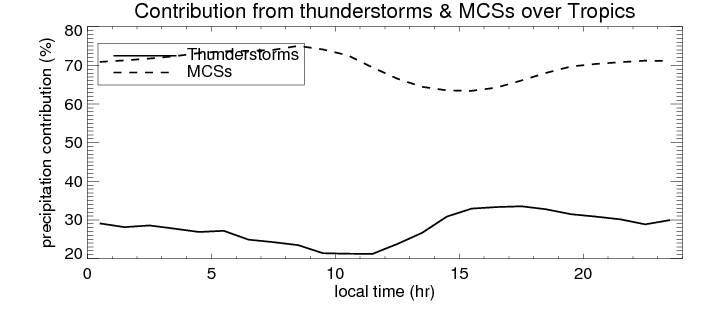 Many studies suggested that the diurnal variation of the precipitation is related to the life cycles of the precipitation systems, which is frequently driven by the surface sensible heating. Over Tropics, mean annual precipitation are estimated with 1221.2 (mm/year) from precipitation radar. Detailed diurnal variation of the precipitation at high resolution can be accessed here (NOTE: it may take long time to generate for a large area). The diurnal variation of precipitation from systems with different sizes and heights are shown below: In total, thunderstorms (systems with detected lightning flashes) contribute 27 %, MCSs (Mesoscale convective systems with raining area > 2000 km^2) contribute 70 % of all precipitation over Tropics. Diurnal variations of fraction of precipitation from thunderstorms and MCSs over Tropics are shown below: Certainly there is a strong diurnal variation of different types of clouds. Because CloudSat observes at 0130 and 1330 local time, here the daytime and night cloud fraction in different seasons are presented: |