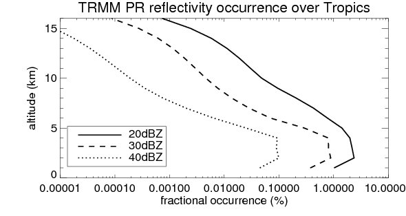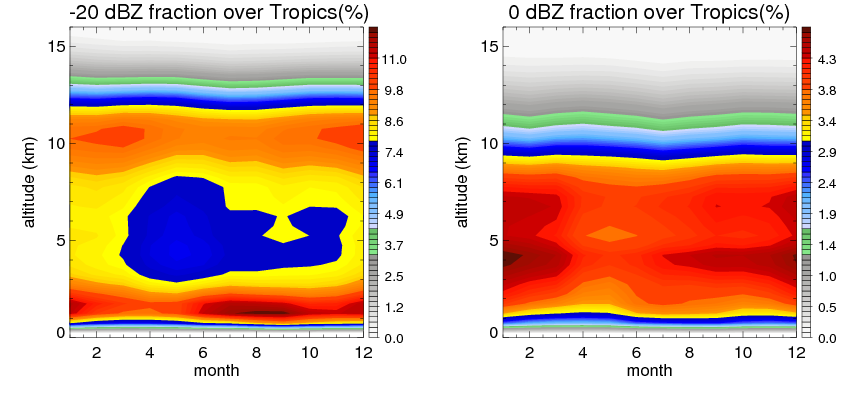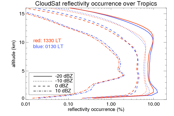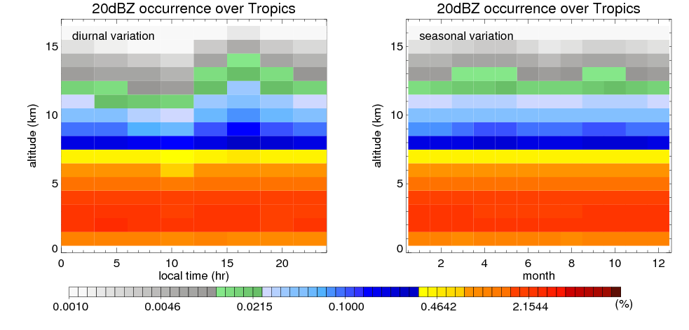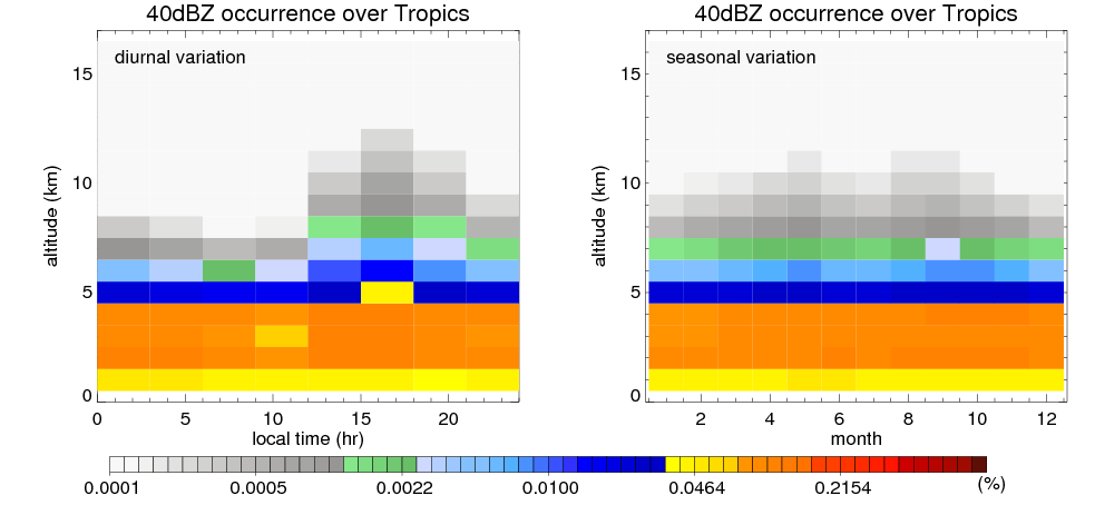Here the precipitation means the precipitable hydrometeors (raindrops, snow flakes, graupel and hails) that detected by TRMM precipitation radar. Following figure shows the vertical profiles of 20, 30 and 40 dBZ fractional occurrence over Tropics in different seasons. The seasonal and diurnal variations of precipitation (20 dBZ) fractional occurrence at different altitudes are shown below: The seasonal and diurnal variations of INTENSIVE precipitation (40 dBZ) fractional occurrence at different altitudes are shown below: Clouds are consisted of small hydrometeors that undetectable by TRMM precipitation radar (Ku band). CloudSat (W band radar) provides the much great details of clouds. Following figure shows the vertical structure of the thin and thick clouds over Tropics. Note that high reflectivity at low levels are less frequent due to the attenuation. The seasonal variation of thin (-20 dBZ) and thick (0 dBZ) cloud over Tropics are shown below: |